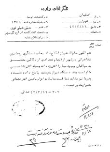 هماكنون ساواك شيراز اطلاع داد به علت دستگيرى روحانيون تظاهراتى در شيراز انجام تعدادى از دكاكين متعلق به بهائيان و يهوديها را آتش زدهاند وسيله آتشنشانى ما كم است چند دستگاه] از] شيراز بفرستيد پاسخ داده شده وضع ما نيز مشابه شما است متأسفانه اعزام ماشين آتشنشانى به شيراز مقدور نيست.