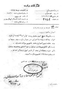 1ـ به طورى كه صبح امروز به عرض رسيد قرار است امشب از طرف افراد مخالف دولت تظاهراتى در چهارباغ ـ چند سينما و چند نقطه شهر انجام دهند مأمورين مراقب هستند.