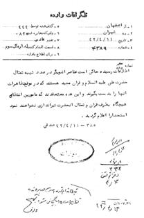 اطلاعات رسيده حاكى است عناصر آشوبگر در صدد تهيه تمثال حضرت على عليهالسلام و قرآن مجيد هستند كه در موقع تظاهرات آنها را به دست بگيرند و اين عده معتقدند كه مأمورين انتظامى هيچگاه به طرف قرآن و تمثال آن حضرت تيراندازى نخواهند نمود. استحضارا اعلام گرديد.