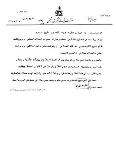 توسط رياست فرماندارى نظامى محضر مبارك حضرت آيتاللّه العظمى و مرجع تقليد عالم تشييع آقاى خمينى مدظله العالى رونوشت حضرت آيتاللّه القمى رونوشت حضرت آيتاللّه محلاتى دامت بركاتها.