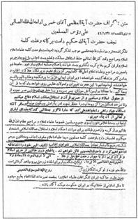 تلگراف محترم در تسليت فاجعه عظيمى موجب تشكر گرديد، اميد است با وحدت كلمه علماء اعلام اسلام و مراجع وقت كثراللّه امثالهم حفظ استقلال مملكت و قطع دست اجانب را نموده از حريم اسلام و قرآن كريم دفاع كرده نگذاريم دست خيانت باحكام مسلمه اسلام دراز شود. ما ميدانيم با هجرت مراجع و علماء اعلام اعلى اللّه كلمتهم مركز بزرگ تشيع در پرتگاه هلاكت افتاده و بدامن كفر و زندقه كشيده خواهد شد؛ و برادران ايمانى عزيز ما در شكنجه و عذاب اليم واقع خواهند شد. ما ميدانيم با اين هجرت تغييرات و تحولات عظيمى روى خواهد داد كه ما از آن بيمناكيم. ما عجالتا در اين آتش سوزان بسر برده و با خطرهاى جانى صبر نموده از حقوق اسلام و مسلمين و از حريم قرآن و استقلال مملكت اسلام دفاع مىكنيم و تا سر حد امكان مراكز روحانيت را حفظ نموده امر بآرامش و سكوت مينمائيم مگر آنكه دستگاه جبار راهى را بخواهد طى كند كه ما را ناگزير بمطالبى كند كه بخداى تبارك و تعالى از آن پناه ميبريم.