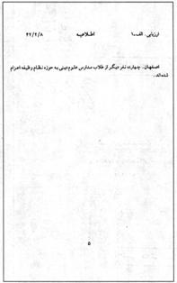 اطلاعيه تاريخ : 8 /2 /42 اصفهان : چهارده نفر ديگر از طلاب مدارس علوم دينى به حوزه نظام وظيفه اعزام شدهاند.