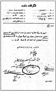 امروز يك برگ اعلاميه استنسل شده از طرف روح اله موسوى خمينى تحت عنوان چهل روز از مرگ عزيزان ما گذشت به صندوق پست اصفهان انداختهاند كه ضبط گرديد. 237 ـ 18 /2 /42 صدقى