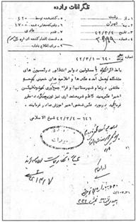 با مذاكراتيكه با مسئولين دواير انتظامى در كميسيونهاى متشكله بعمل آمده عكسها و اعلاميههاى خمينى بنحو مقتضى در تمام شهرستانها و قراء جمع آورى ميشود، ليكن اخيرا عكس سيد كاظم شريعتمدارى نيز توزيع ميگردد. مقرر فرماييد در مورد عكس شخص اخير آموزش صادر فرمايند.