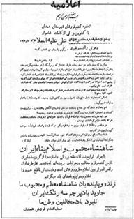 با اجراى لوايح ششگانه حلقه بردگى و اسارت را از گردن ملت ايران باز مىكنند هر فرد مخالف در هر لباس و پيشهاى كه باشد در نظر طرفداران واقعى اصولى دين اسلام مطرود و خائن است و ما پشتيبانى قاطع خود را اعلام ميداريم و با صداى بلند ميگوئيم.