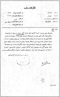 بطوريكه بعرض رسيد اخيرا اعلاميهاى از طرف آقاى خمينى در مورد اسرائيل و قطع رابطه با آن كشور پخش در شهرستان شيراز چون تعداد يهودى از ساير نقاط كشور زيادتر است و از تجار و كسبه طلبكار ميباشد اين موضوع موجب شده از طرف اشخاصى كه به يهوديان بدهكار هستند موضوع از جنبه دولت اسرائيل خارج و حمله مستقيم روى منبر متوجه اين اشخاص شود برابر اطلاع كسب شده اين صحبتها باعث توحش آنان شده و تصميم دارند كه آقاى كهنيم را بتهران اعزام و حتى اظهار داشتهاند حاضريم تمام اموال خود را فروخته به كشور اسرائيل بازگشت نمائيم.