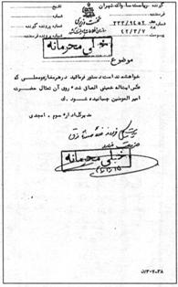 خواهشمند است دستور فرمائيد در هر مغازه و محلى كه عكس آيتاله خمينى الصاق شده روى آن تمثال حضرت امير المومنين چسبانيده شود.
