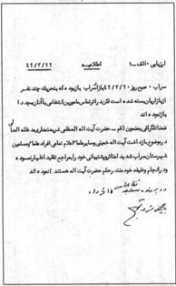 ضمنا تلگرافى بمضمون (قم ـ حضرت آيتاله العظمى شريعتمدارى مدظله العالى در موضوع بازداشت آيتاله خمينى و ساير علماء اعلام تمامى افراد علماء و مسلمين شهرستان سراب شديدا متاثر و پشتيبانى خود را به مراجع تقليد اظهار نموده و در انجام وظيفه خود منتظر حكم حضرت آيتاله هستند) نمودهاند.