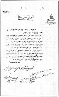 «بنام مسلمانان و هيات علميه نجف اشرف از اعمال جنايتكارانهاى كه مقامات تبهكار ايران بعمل ميآورند از قبيل قتل و مضروب ساختن مردم و بازداشت و زندانى كردن مراجع تقليد و فرستادن آنها بدادگاههاى نظامى شديدا اظهار تنفر نموده و از مسلمانان در تمام جهان ميخواهيم براى كمك به برادران خود در ايران قيام كرده و آنها را از چنگ استعمار ستمگر نجات دهند.