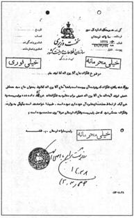 روز گذشته يكفقره تلگراف كه رونوشت آن پيوست است بامضاء حاج آقا روحاله كمالوند بعنوان حاج سيد مصطفى خمينى فرزند آيتاله حاج آقا روحاله خمينى براى مخابره به تلگرافخانه خرمآباد داده شده و رئيس پست و تلگراف خرم آباد از لحاظ مصلحت از مخابره آن خوددارى نموده است. عليهذا خواهشمند است چگونگى به وزارت و تلگراف منعكس شود كه عمل رئيس پست و تلگراف لرستان صرفا روى مصحلت بوده است.