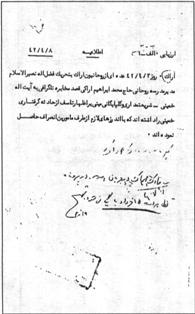 اراك. روز 3 /4 /42 عدهاى از روحانيون اراك بتحريك فضلاله نصيرالاسلام مدير مدرسه روحانى حاج محمد ابراهيم اراكى قصد مخابره تلگرافى به آيتاله خمينى ـ شريعتمدارى و گلپايگانى مبنى بر اظهار تاسف از حادثه گرفتارى خمينى را داشتهاند كه با اندرزهاى لازم از طرف مامورين انصراف حاصل نمودهاند.