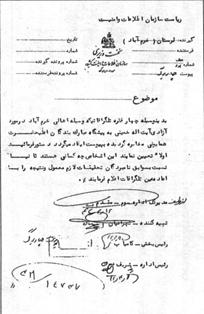 بدينوسيله چهار فقره تلگرافاتيكه وسيله اهالى خرمآباد در مورد آزادى آيتاله خمينى به پيشگاه مبارك بندگان اعليحضرت همايونى مخابره گرديده بپيوست ايفاد ميگردد دستور فرمائيد اولاً تعيين نمايند اين اشخاص چه كسانى هستند ثانيا نسبت بسوابق نامبردگان تحقيقات لازم معمول و نتيجه را با اعاده عين تلگرافات اعلام فرمايند.