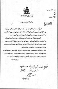با عرض مراتب بالا خواهشمند است مقرر فرمايند طى بخشنامه سرّى بكليه وزارتخانهها و سازمانهاى دولتى دستور اكيد صادر شود كه قبل از اينكه دعوت مقامات دولتى اسرائيل را جهت اعزام كارمندان خود بآنكشور قبول نمايند نظر وزارت امور خارجه را در اينمورد سئوال نمايند.