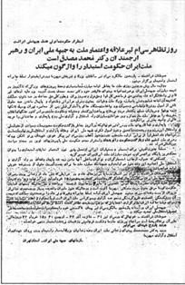 هموطنان شرافتمند ـ خونهائى كه در سىم تير 31 ـ شانزده آذر 32 ـ اول بهمن 40 و 15 خرداد 42 و روزهائى نظير آن بر خاك ريخته است سرانجام پيروزى ملت ما و شكست فرجامينى دژخيمان بى شفقت استعمار منتهى خواهد شد.