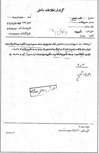 در ساعت 2030 روز 3 /5 /42 شخصى بنام منصور فرزند محمد حسين شهرت كمائى در بساط پلاستيك فروشى خود واقع در تجريش تعدادى از عكسهاى خمينى را در معرض ديد عابرين قرار داده است.