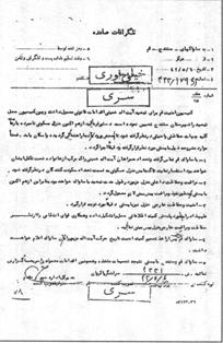 كميسيون امنيت قم براى تبعيد آيتاله خمينى اقدامات قانونى معمول داشته و چون كميسيون محل تبعيد را شهرستان سنندج تعيين نموده است. دستور فرمائيد از هم اكنون منزل مسكونى نامبرده با رعايت كليه جهات حفاظتى و امنيتى در نظر گرفته شود تا بمحض ورود بآنجا راهنمائى گرديده و اسكان يابد. ضمنا موارد مشروحه ذيل بايستى مورد نظر قرار گرفته و دقيقا اجرا گردد.