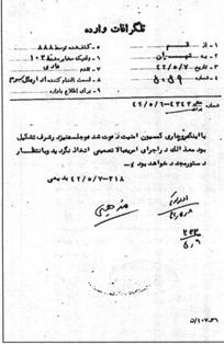 با اينكه روز جارى كميسيون امنيت دعوت شده و جلسه نيز در شرف تشكيل بود معذالك در اجراى امريه بالا تصميمى اتخاذ نگرديد و بانتظار دستور مجدد خواهد بود. 318 ـ 7 /5 /42 بديعى