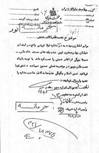 برابر اطلاع رسيده به درب مغازه لولا فروشى واقع در ابتداى خيابان بوذرجمهرى غربى جنب پلههاى مسجد شاه عكس نسبتا بزرگى از آقاى خمينى را نصب كردهاند با توجه باينكه نصب عكس مزبور در موقعيت فعلى صحيح نميباشد دستور فرمائيد. ضمن اعلام چگونگى مشخصات كامل صاحب مغازه را تهيه و ارسال فرمايند.