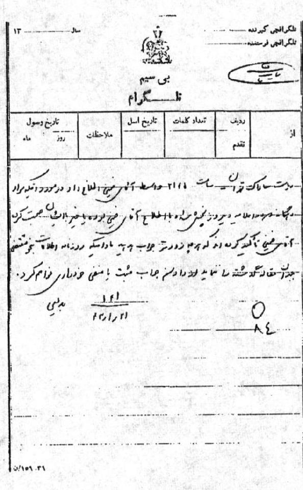 رياست ساواك تهران ـ ساعت 2145 واسطه آقاى خمينى اطلاع داد در مورد اينكه مواد دهگانه كه در اعلاميه ديروز پخش شده با اطلاع آقاى خمينى بوده يا خير با ايشان صحبت كرده آقاى خمينى تأكيد كردهاند كه هر چه زودتر جواب بدهيد مادامى كه روزنامه اطلاعات بنحو مقتضى جبران مقاله گذشته را ننمايد از دادن جواب مثبت يا منفى خوددارى خواهم كرد. بديعى