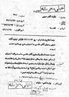 حضرت حجهالاسلام والمسلمين آقاى خادمى دامت بركاته. اصفهان از مساعى جميله جناب عالى متشكر توفيق علماء اسلام را در احقاق حق و ابطال باطل خواستار است مستدعى است كه تشكر اينجانب را به حضرات حجج اسلام دامة بركاتهم ابلاغ لازم است مندرجات روزنامه اطلاعات سه شنبه را جدا امر به تكذيب فرمايند خمينى.