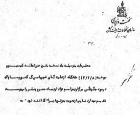 محترما بدينوسيله يك نسخه متن صورتجلسه كميسيون مورخه (8 /2 /43) متشكله از نمايندگان شهربانى كل كشور و ساواك در مورد چگونگى برگزارى مراسم عزادارى ماه محرم و صفر را به پيوست تقديم مىدارد تا پس از تصويب به موقع اجراء گذاشته شود. در مورد تشكيل جلسات سوگوارى در تكايا و مساجد و منازل و همچنين حركت دستجات عزادارى در ماههاى محرم و صفر سال جارى در تهران و شهرستانها بررسيهاى لازم معمول و مراتب بشرح زير پيشنهاد مىگردد كه پس از تصويب به صورت دستورالعمل به شهربانيها و ساواكهاى شهرستانها و همچنين به پليس و ساواك تهران ابلاغ گردد: