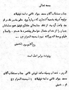 موقومه «شريفه بضميمه» اشعارى كه درباره ورود حقير به شهر مقدس قم بود واصل گرديد از تفقد جنابعالى متشكرم توفيق عموم مسلمانان جهان را از خداى متعال خواستار و ملتمس دعا هستم. والسلام عليكم و رحمهاللّه و بركاته.