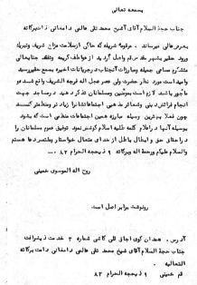 جناب حجهالاسلام آقاى آشيخ محمدتقى عالمى دامغانى دامت بركاته به عرض عالى مىرساند. مرقومه شريفه كه حاكى از سلامت مزاج شريف و تبريك ورود حقير به شهر مقدس قم واصل گرديد از عواطف كريمه و تفقد جنابعالى متشكرم مساعى جميله و مبارزات آن جناب در جريانات اخيره به سمع حقير رسيد و اميد است مورد نظر حضرت ولى عصر عجلاللّه فرج الشريف واقع شده و مأجور باشيد لازم است به مؤمنين و مسلمانان تذكر دهيد در مساجد جهت انجام فرائض دينى و شعائر مذهبى اجتماعاتشان را زيادتر و منظمتر كنند چون فعلاً بهترين وسيله مبارزه همين اجتماعات منظمى است كه بشود به وسيله آنها در اعلام كلمه طيبه اسلام كوشش نمود توفيق عموم مسلمانان را در احقاق حق و ابطال باطل از خداى متعال خواستار و ملتمس دعا هستم والسلام عليكم و رحمهاللّه و بركاته.