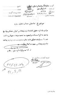 آقاى فرماندار شهرستان مرند موجودى و هويت صاحبان حساب جارى شماره 490 را كه در روز 15 خرداد كه بلوا و آشوبى از طرف پارهاى عناصر اخلالگر به عمل آمده و مشكوك به نظر رسيده با اسامى افرادى كه به اين حساب وجوهى واريز نمودهاند از رياست بانك صادرات مرند استعلام پاسخ واصله حاكيست كه بانك مزبور دادن جواب به مطالب يادشده را منوط به اجازه اداره حقوقى بانك نموده است.