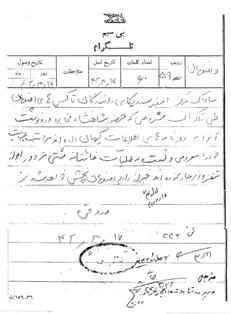 ساواك مركز امروز سنديكاى رانندگان تاكسىهاى اصفهان طى تلگراف مشروحى كه حضور شاهنشاه مخابره و رونوشت آن را به روزنامههاى اطلاعات كيهان دادهاند مراتب عبوديت خود را معروض و نسبت به عمليات خائنانه و وحشيانه مشتى مزدور ابراز تنفر و انزجار نمودهاند خبر از راديو اصفهان پخش خواهد شد.