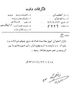 بازار اصفهان امروز به مناسبت تصادف با روز چهلم جريانات 15 خرداد 42 باز نشده است وضع بازار ساير شهرستانها پس از رسيدن خبر به عرض خواهد رسيد.