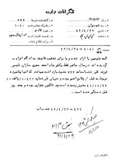 كليه متهمين يا آزاد شده و يا براى تعقيب قانونى به دادگاه اعزام گرديدهاند در حال حاضر فقط يك نفر به نام احمد مجرىسازان طوسى فرزند قلى شناسنامه 733 مشهد بازداشت مىباشد كه اتهام نامبرده مربوط به قبل از وقايع اخير بوده و جريان طى شماره 10422/م الف 11 ـ 22 /11 /41 به عرض رسيده است وى تاكنون متوارى بوده و چند روز قبل دستگير شده است.