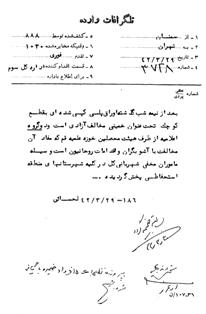 بعد از نيمه شب گذشته اوراق پلىكپى شدهاى به قطع كوچك تحتعنوان خمينى مخالف آزادى است و دو گروه اعلاميه از طرف هيئت محصلين حوزه علميه قم كه مفاد آن مخالفت با آشوبگران و اقدامات روحانيون است وسيله مأموران مخفى شهربانى كل در كليه شهرستانهاى منطقه استحفاظى پخش گرديده.