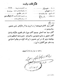 آقاى سيد عبدالعلى موسوى1 ـ آقاى ميرزاباقر ظفورى تلگراف واصل آقاى خمينى و ساير محبوسين سالم[،] وارد حضرت عبدالعظيم شدم به وظيفه شرعى كه در اين خصوص دارم اقدام كرده و مىكنم احتياجى به دعاى خير آقايان دارم.
