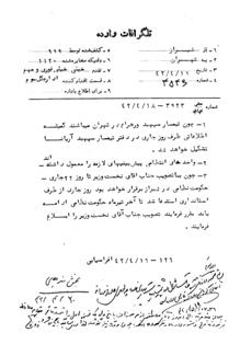 3ـ چون با تصويب جناب آقاى نخستوزير تا روز 22 جارى حكومت نظامى در شيراز برقرار خواهد بود روز جارى از طرف استاندارى استدعا شد تا آخر تير ماه حكومت نظامى ادامه يابد مقرر فرمايند تصويب جناب آقاى نخستوزير را ابلاغ فرمايند.