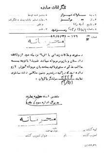 اين تلگراف بدون بررسى مخابره شد پاسخ داده شود ـ دستور عدم ملاقات زندانى اقرباء نزديك از وظايف دادستان و بازپرس مربوطه است. 31 /4