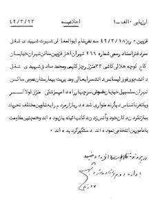 قزوين. روز 18 /3 /42 سه نفر به نام ابوالمعالى شهرت شهيدى شغل سردفتر اسناد رسمى شماره 269 تهران اهل قزوين ساكن تهران خيابان كاخ كوچه هلالى كاشى 33 منزل رچل كليمى و محمدصادق شهيدى شغل دانشجوى فوقليسانس دانشسرايعالى و مديريت بيمارستان عمومى ساكن تهران سلسبيل خيابان خوش سر چهارراه دامپزشكى منزل لولاگر و يك نفر ناشناس ديگر كه متوارى شده در بازار مردم را به عناوين مختلف تحريك به باز نكردن دكان خود و آتش زدن دكانهايى كه باز بودهاند و همچنين مقاومت با مأمورين انتظامى نمودهاند دستگير گرديدهاند.