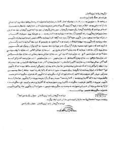 در ساعت ½ 10 صبح مورخه 15 /3 /42 موقعى كه اهالى كاشان در خيابانها مشغول دادن شعار برعليه دولت، و ازدحام به ادارات دولتى بودند اطلاع رسيد در قريه آران و بيدگل نيز اشخاصى تجمع و مشغول دادن شعار عليه دولت و غارت منزل اشخاص مىباشند كه بلافاصله گروهبان يكم صميميت و گروهبان سوم رضايى و گروهبان سوم مردانشاهى و گروهبان سوم حداديان به محل مزبور اعزام و مأمورين در سه كيلومترى آران مشاهده مىنمايند عدهاى در حدود 500 نفر با يك بيرق سبز به طرف كاشان در حركت مىباشند به محض ديدن مأمورين عموما قرآن سر دست گرفته اظهار مىنمايند ما آقاى خمينى را مىخواهيم و به طرف مأمورين حملهور مىشوند كه مأمورين چند تير هوايى شليك كه در نتيجه عده آنها متفرق و دو نفر معمم كه سردسته آنها بوده است به آنان تذكر مىدهند كه دستور دهيد جمعيت به طرف آران برگردند و نيز با سردسته جمعيت مذاكره و به آران بر مىگردد و مأمورين به محض ورود به آران مشاهده مىنمايند كه چند محل را اشخاص به شرح زير 1ـ مغازه خياطى القانى 2ـ مغازه داروفروشى ـ محمد لامع 3ـ منزل حسين لامع 4ـ منزل رحمتاله يزدانى 5 ـ مغازه خياطى محمود رحمانى 6ـ مغازه جواد فرقانى 7ـ منزل جواد فرقانى 8ـ مغازه و منزل آقاى مشفق 9ـ منزل بحينى 10ـ منزل محلوجى 11ـ منزل رحمتاله نراقى كه كليه آنان بهايى مىباشند درب منازل و دكاكين را شكسته و داخل منزل و مغازه آنان شده چيزهايى كه قابل بردن بوده به سرقت برده و بقيه را نيز آتش زدهاند كه وضع محل را متشنج صاحبان خانه و مغازه را به طور كلى از هستى ساقط نمودهاند كه مأمورين فورا انتظامات را برقرار مىنمايند لذا به گروهبان يكم صميميت دستور داده شد كه با كمال قدرت امنيت منطقه را حفظ و مسببين و محركين جريان آتشسوزى و سرقت اثاثيه و اشخاص فوقالذكر را دستگير نمايد لذا مأمورين كه مشغول دستگيرى اشخاص مسبب و تكميل پرونده بودهاند آقاى بازپرس شعبه 1 كاشان شخصا جهت رسيدگى به آران عزيمت و پرونده را از مأمورين خواستار كه مأمورين نيز پرونده را با پنج نفر متهم دستگير شده به آقاى بازپرس تحويل مىنمايند كه آقاى بازپرس هم براى پنج نفر دستگير شده قرار لازمه صادر و به زندان شهربانى تحويل شدند و نسبت به دستگيرى بقيه متهمين دستورات لازم به مأمورين صادر و اكنون مأمورين مشغول دستگيرى بقيه متهمين مىباشند.