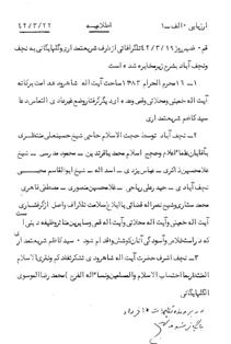1ـ 16 محرمالحرام 1383 ساحت آيتاللّه شاهرودى دامت بركاته ـ آيتاللّه خمينى و محلاتى و قمى و عدهاى ديگر گرفتار وضع غيرعادى التماس دعا سيدكاظم شريعتمدارى.