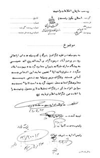 بدينوسيله دو فقره تلگراف (6 برگ) كه وسيله عدهاى از اهالى رودسر و رحيمآباد در مورد آزادى آيتاللّه روحاللّه خمينى به پيشگاه مبارك ملوكانه به تهران مخابره گرديده به پيوست ايفاد مىگردد دستور فرماييد اولاً تعيين نمايند اين اشخاص چه كسانى هستند و تلگراف مزبور وسيله چه شخصى جهت مخابره به تلگرافخانه محل تحويل گرديده است ثانيا نسبت به سوابق افراد مذكور در تلگراف تحقيقات لازم معمول و نتيجه را با اعاده عين تلگرافات اعلام نمايند.