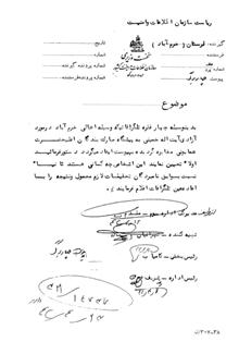 بدينوسيله چهار فقره تلگرافاتى كه وسيله اهالى خرمآباد در مورد آزادى آيتاللّه خمينى به پيشگاه مبارك بندگان اعليحضرت همايونى مخابره گرديده به پيوست ايفاد مىگردد دستور فرماييد اولاً تعيين نمايند اين اشخاص چه كسانى هستند ثانيا نسبت به سوابق نامبردگان تحقيقات لازم معمول و نتيجه را با اعاده عين تلگرافات اعلام فرمايند.