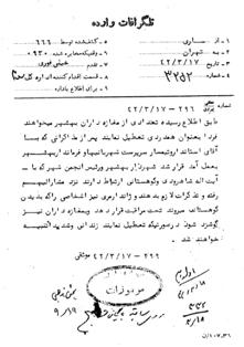 طبق اطلاع رسيده تعدادى از مغازهداران بهشهر مىخواهند فردا به عنوان همدردى تعطيل نمايند پس از مذاكراتى كه با آقاى استاندار و تيمسار سرپرست شهربانىها و فرماندار بهشهر به عمل آمد قرار شد شهردار بهشهر و رئيس انجمن شهر كه با آيتاللّه شاهرودى و كوهستانى ارتباط دارند نزد مشاراليهم رفته و تذكرات لازم بدهند و ژاندارمرى نيز اشخاصى را كه به ديدن كوهستانى مىروند تحت مراقبت قرار دهد و به مغازهداران نيز گوشزد شود در صورتى كه تعطيل نمايند زندانى و شديدا تنبيه خواهند شد.