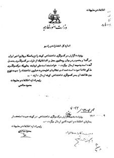 از روز بعد تاكنون هر روز جماعت زيادى كه در ميان آنها از هر طبقه ديده مىشود باز به ديدن اينجانب آمده موفقيت دولت را در سركوبى عناصر ماجراجو تبريك مىگويند و با احساساتى كه واقعا كمنظير است تقاضا دارند تمثال همايونى به آنها داده شود تا زينت منازل و اماكن خود سازند. اينجانب در حدود يك صد قطعه تمثال همايونى را كه در اينجا موجود بود بين آنها توزيع نمودم و ديگر چيزى باقى نمانده است و اكنون تقاضا دارد مقرر فرمايند از اداره كل انتشارات و راديو يا هر مقام ديگرى كه از تمثالهاى همايونى در اختيار دارند هر چه زودتر تعداد يك هزار نسخه گرفته و به اين نمايندگى ارسال دارند تا بين مردم توزيع شود مزيد تشكرات صميمانه خواهد بود. در خاتمه اين نكته را نيز به استحضار مىرساند كه اينجانب به نحو مقتضى از احساسات صميمانه و ارشاد خيرخواهانه آقاى آسيد حسن غزنوى تشكر كردهام.