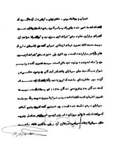 ارتش شاه ادعا كرد كه اغتشاشات مذهبى ضد دولتى را در سراسر كشور درهم شكسته و تأكيد نمود كه براى برقرارى نظم دستور «تيراندازى به سوى مردم» را اجرا خواهد كرد سپهبد نعمتاللّه نصيرى1 فرماندار نظامى تهران گفت من اطمينان دارم كه نظم و آرامش برقرار شده است. وى افزود ولى هنوز دستور «تيراندازى به سوى مردم» شاه لغو نشده و به قوت خود باقى است. سپهبد نصيرى گفت در شهر شيراز شب گذشته ميان سربازان و اغتشاشكنندگان زدوخوردهايى درگرفت. وى خاطرنشان ساخت كه از روز 2شنبه و آغاز اغتشاشات تعداد كشتهشدگان به 86 نفر و زخمىشدگان به 193 تن رسيده است. سپهبد نصيرى اظهار داشت اغتشاشات ديشب شيراز ناچيز بوده و بىدرنگ به وسيله سربازان درهم شكسته شده است. وى همچنين گفت امروزه در هيچ كجاى كشور اغتشاشات تازهاى بروز نكرده است. از صبح امروز ارتش مسلسل و نيروهاى سرباز را از نقاط [ناخوانا] شهر خارج كرد. ولى چندين تانك ساخت امريكا در برابر چشم مردم ساكت شهر در رفتوآمد بود. درجهدارهاى پاسدار نظامى در جيپ در گوشه و كنار رفتوآمد مىكردند. ساعت منع عبور و مرور كاهش يافت و از 11 شب [ناخوانا] صبح شد. ولى احتمال مىرود كه مقررات حكومت نظامى تا يك ماه ديگر ادامه يابد تا دادگاههاى نظامى متهمين را كه تعدادشان دست كم 200 تن تخمين زده شده است محاكمه كنند... «پارازيت» مخالفت روحانيان با اصلاحات ارضى شاه و همچنين شركت بانوان در انتخابات مىباشد... «پارازيت» سفارت خانههاى خارجى تعداد كشتهشدگان را بيشتر مىدانند... «پارازيت»