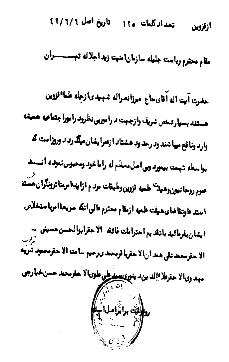 حضرت آيتاللّه آقاى حاج ميرزا نصراللّه شهيدى از جمله علماء قزوين هستند بسيار شخص شريف و از جهت در امور بىنظر و در امور اجتماعيه هميشه وارد و نافع مىباشند و در حدود هشتاد از عمر ايشان مىگذرد دو روز است كه به واسطه تهمت بىمورد و بىاصل معظمله را ماخود و محبوس نمودهاند عموم روحانيون و هيئت علميه قزوين و طبقات مردم از اين امر متأثر و نگران هستند استدعا و تقاضاى هيئت علميه از مقام محترم عالى آن كه سريعا امر به استخلاص ايشان بفرماييد با تقديم احترامات فائقه الاحقر ابوالحسن حسينى ـ الاحقر محمدتقى همدان ـ الاحقر باقر محمدى رحيم سامت ـ الاحقر محمود شريعت مهدوى ـ الاحقر علاءالدين دينورى ـ سيدعلى علوى ـ الاحقر محمدحسين خيارجى